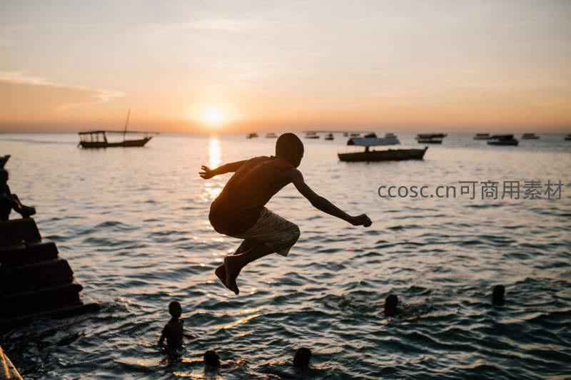 夕阳下少年跃入海中溅起水花