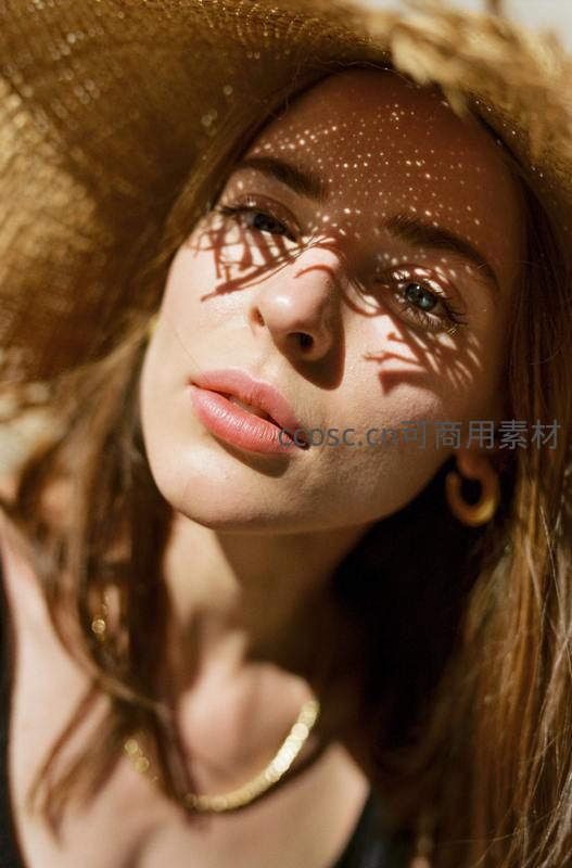 草帽下的光影艺术,斑驳树影洒落美人脸庞