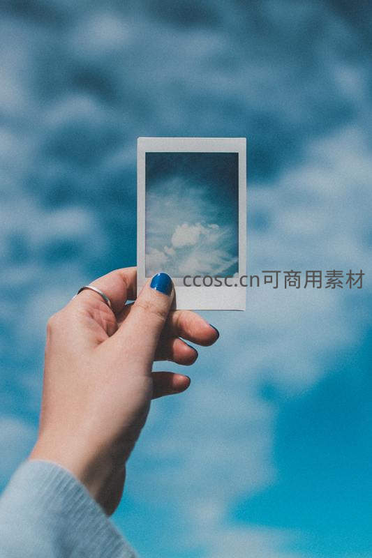 一只涂着蓝色指甲油的手举着一张刚拍好的拍立得照片,照片内容与背景的蓝天白云完美融合,充满文艺与怀旧气息。