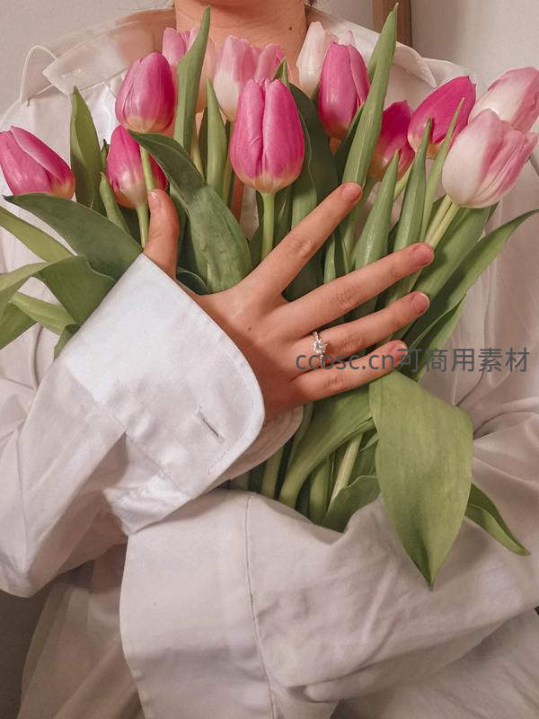 一位女性身着白色衬衫,双手轻柔环抱一束盛开的粉白郁金香,手指上佩戴着精致钻戒,画面充满温馨与爱意。