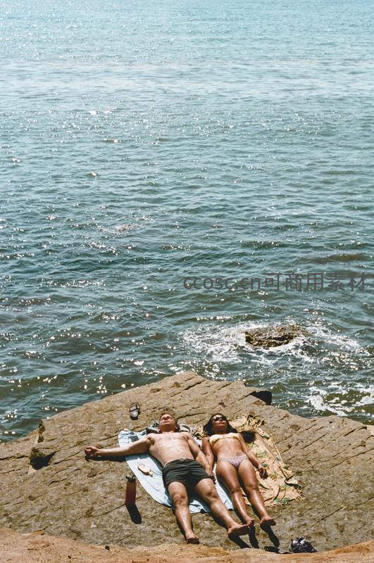 一对情侣躺在临海的岩石上,沐浴着温暖的阳光,听着海浪拍岸的声音。这是一个远离喧嚣、只属于彼此的宁静时刻。