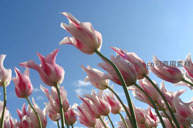 在晴朗蔚蓝的天空下,一簇簇粉白相间的郁金香昂首挺立,花瓣随风轻舞,展现出春天独有的清新与活力,是自然风光中的绝美一景。