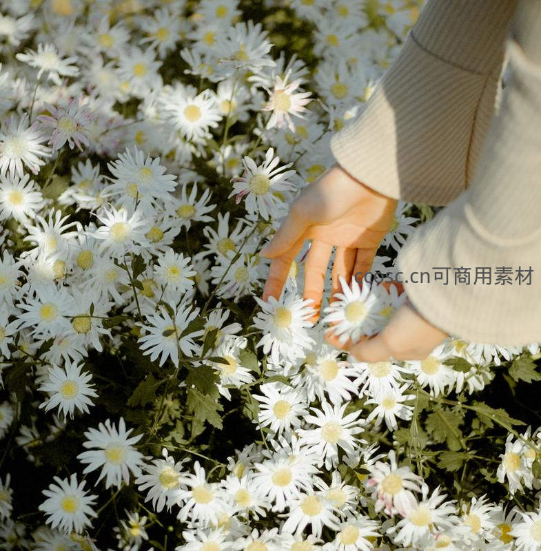 一双纤细的手轻轻拂过盛开的白色雏菊花丛,阳光透过花瓣洒下斑驳光影,画面温馨柔美,仿佛能闻到春天田野间清新的花香。