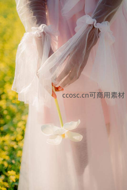 特写镜头捕捉到女子纤细双手,轻握一支洁白花朵,袖口薄纱随风微扬,背景是模糊的金色花田,整体画面温柔梦幻,充满浪漫气息。