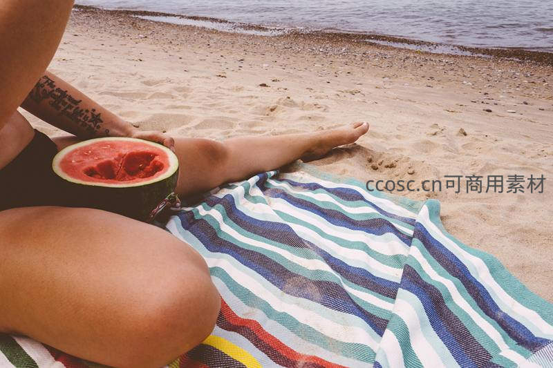 沙滩上享用西瓜,条纹浴巾伴海风惬意