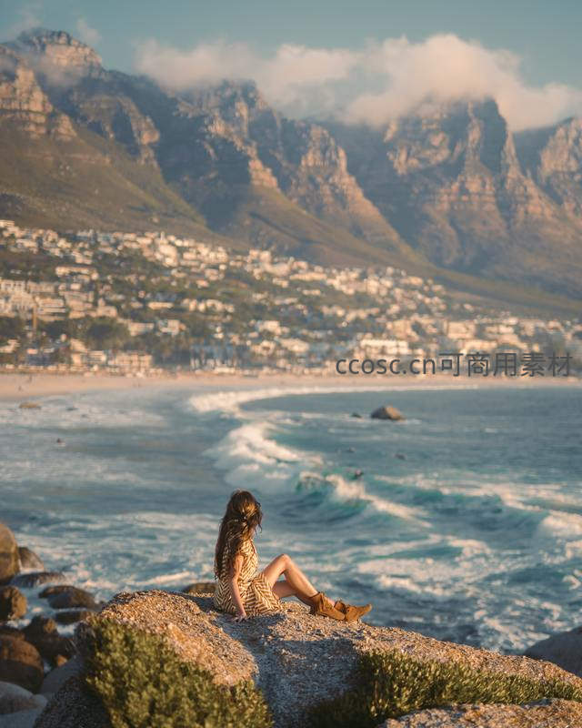 一名女子独自坐在海边的岩石上,背对镜头,凝视着波涛汹涌的大海和远处依山而建的城市。阳光洒落,氛围宁静而治愈。
