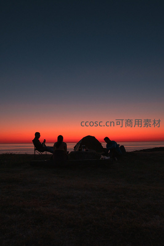 三人在海边草地上搭起帐篷,以绚烂的晚霞为背景,他们的剪影勾勒出一幅静谧而浪漫的画面,象征着友谊与自由。