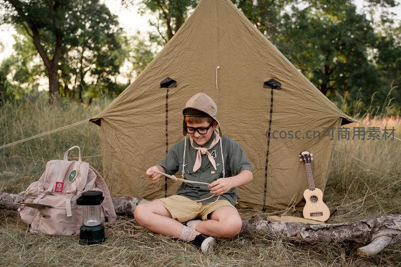 一个戴眼镜的童子军男孩坐在草地上,面前是卡其色帐篷,他正专注地摆弄绳索,旁边放着尤克里里和背包,充满童趣与冒险气息。