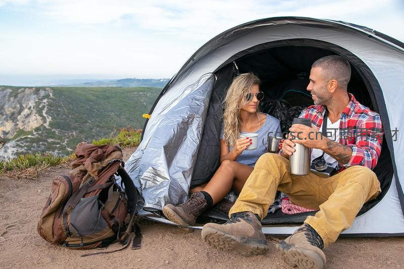 一对情侣坐在山顶帐篷里,手捧热饮对视微笑,身后是辽阔山谷,背包放在一旁,尽享温馨浪漫的户外慢生活。