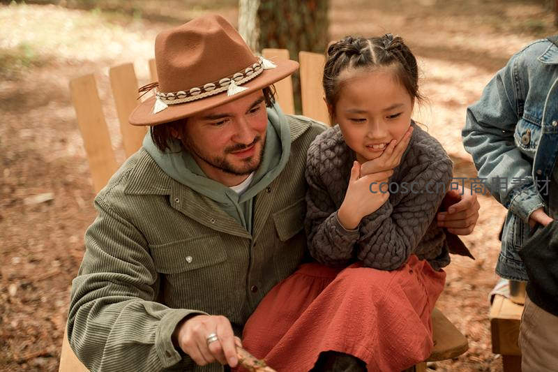 戴棕色帽子的父亲坐在木椅上,怀抱着穿红色裙子的女儿,两人专注看着手中的树枝。阳光透过树叶洒下斑驳光影,传递着浓浓的亲情与宁静的自然气息。