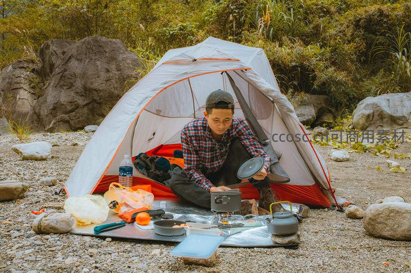 溪边岩石上男子帐篷内专注准备野餐美食