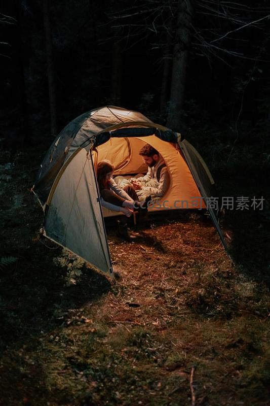 夜幕下情侣在帐篷内共享温暖