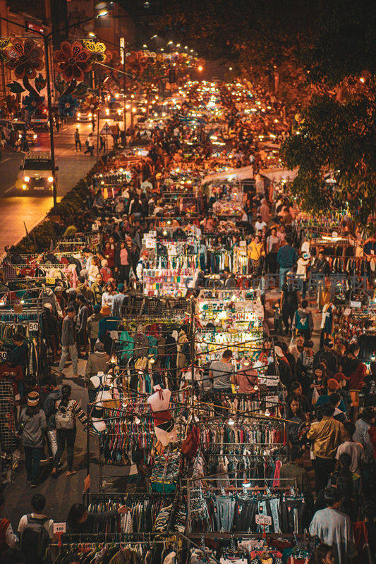 俯瞰夜市灯火辉煌,摊贩如织人流如潮