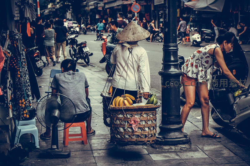 一位头戴斗笠的小贩肩挑装满香蕉与青果的竹编篮筐,站在街角等待顾客,周围行人匆匆,摩托车停靠路边,展现东南亚街头真实而生动的生活图景。
