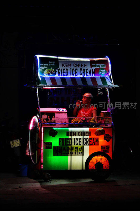 一辆装饰着彩色霓虹灯的“KEM CHIEN”炸冰淇淋手推车在黑夜中格外醒目,商贩坐在车后,为顾客准备着独特的街头美味。