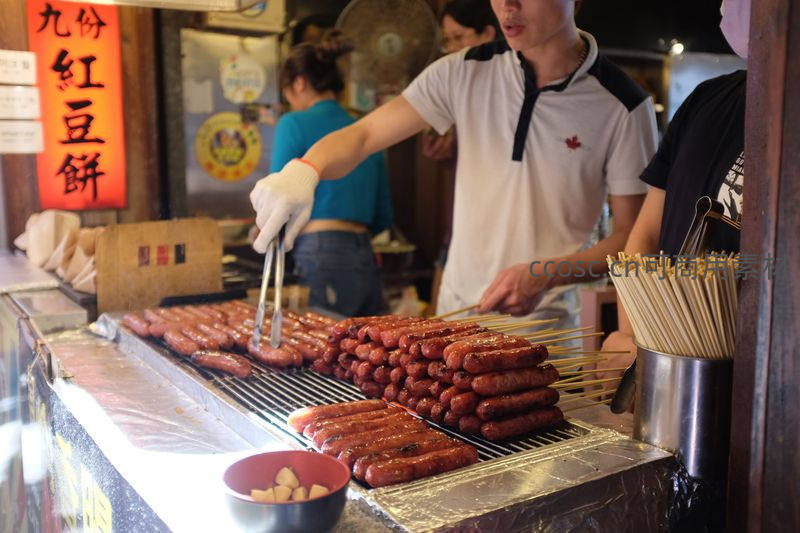 夜市摊主正用夹子翻动烤架上的香肠,金黄焦香的肉串排列整齐,吸引着过往行人驻足品尝这地道风味。