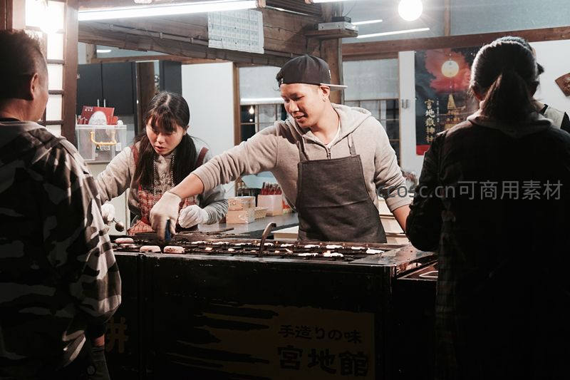 在热闹的夜市摊位前,摊主正专注地在铁板上烤制食物,顾客围在旁边,招牌上写着“手造りの味”,充满地道的街头烟火气。