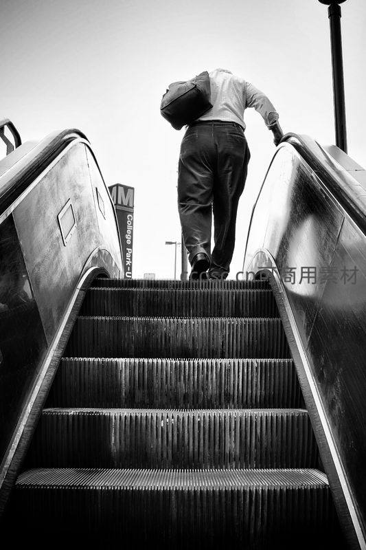 从低角度仰拍一名背着包的男子正乘坐自动扶梯向上,画面采用黑白色调,突显金属质感和线条,传达都市通勤的孤独感。