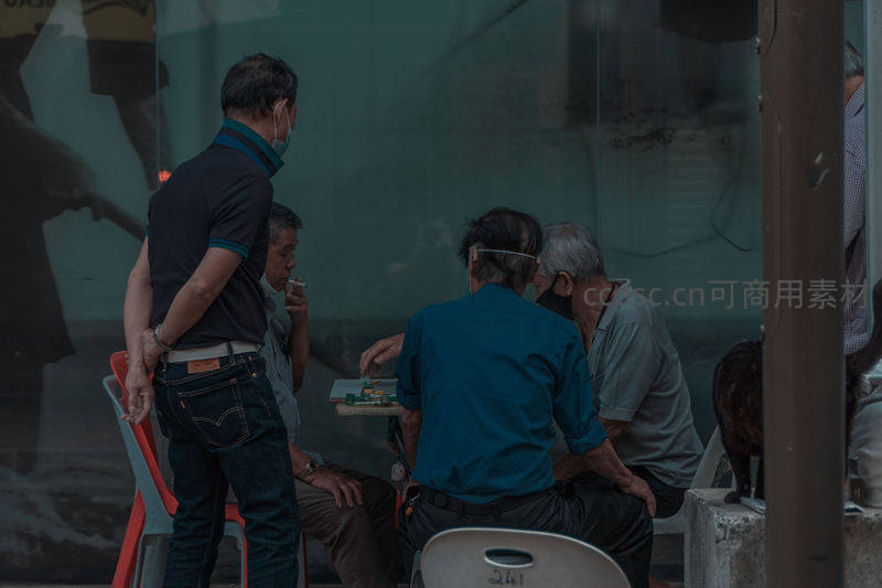 几位年长者在街边小桌旁专注下棋,一人站立观战,氛围宁静而亲切,展现了城市角落里平凡却温暖的生活片段与代际交流。