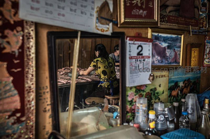透过镜面反射,一位身穿黄底波点上衣的厨师正在案板前专注处理食材,周围摆满瓶罐调料与装饰画,营造出充满人情味与传统工艺感的烹饪场景。