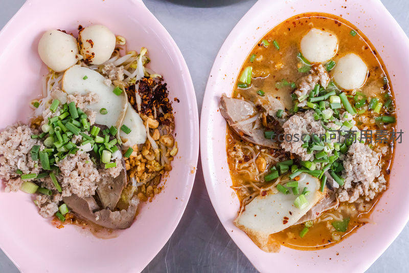 两碗热气腾腾的泰国街头美食,配料丰富诱人