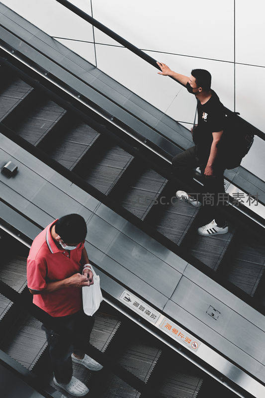 从高处俯瞰商场自动扶梯,两位戴口罩的男士一前一后站立,一人专注手机,一人手扶栏杆,展现现代都市人匆忙而独立的日常片段。