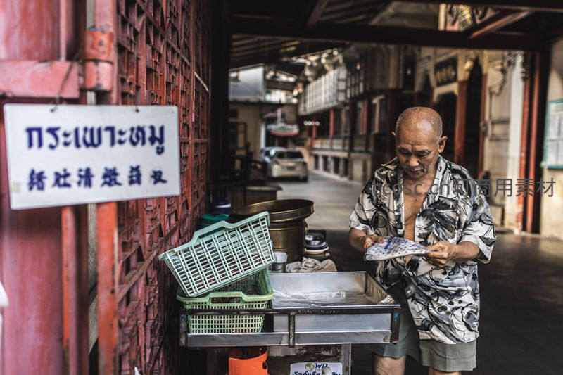 一位年长摊贩在老街巷口认真准备食材,身旁是绿色塑料篮和金属操作台,墙上挂着泰文与中文招牌,传递出浓厚的本地生活烟火气。