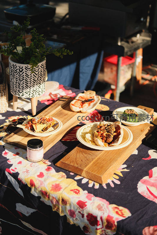 户外野餐桌上美食阳光明媚