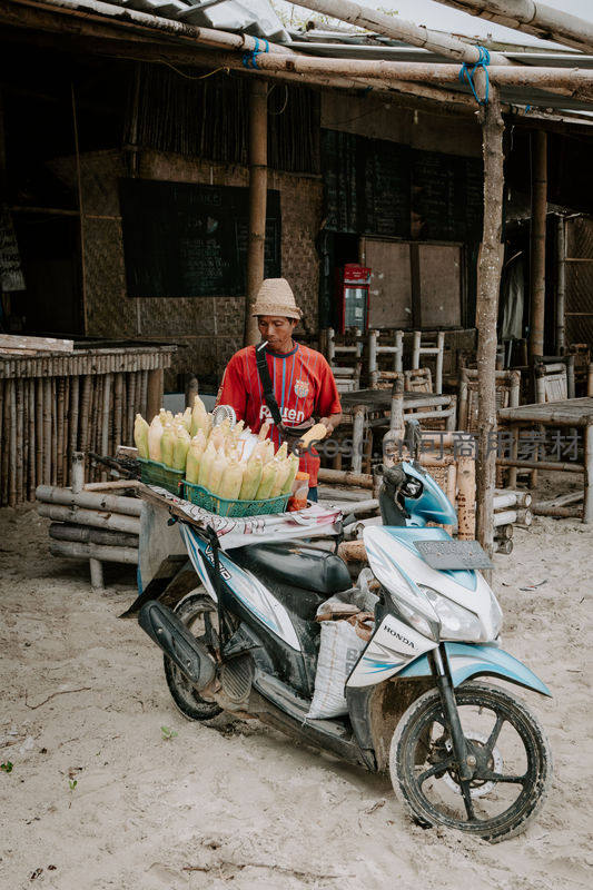 一位戴着草帽的摊贩站在沙滩上的竹棚下,身旁停着一辆载满新鲜玉米的摩托车,展现了热带地区充满烟火气的日常景象。