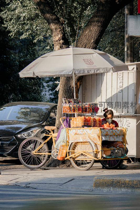 树荫下三轮车小吃摊贩售卖色彩缤纷的零食