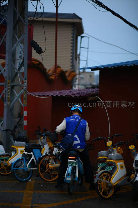 蓝衣骑手整理共享单车,黄昏街角
