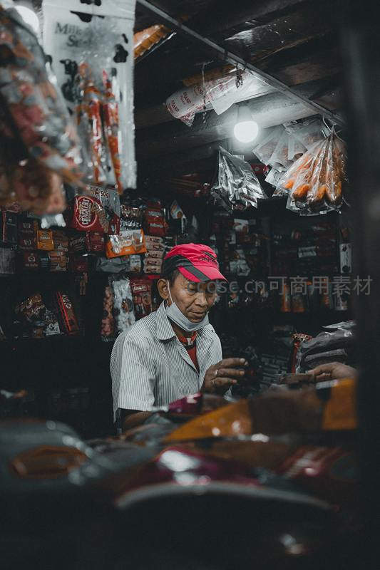 在灯光昏暗、货架堆满商品的狭小店铺内,一位戴着红色帽子的店主正低头忙碌,周围悬挂着琳琅满目的包装食品,营造出浓厚的生活气息。