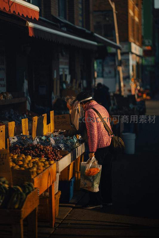 温暖的夕阳光线洒在街边水果摊上,一位穿着粉色外套的顾客正仔细挑选着水果,装满蔬果的木箱和深色背景形成对比,充满生活温度。