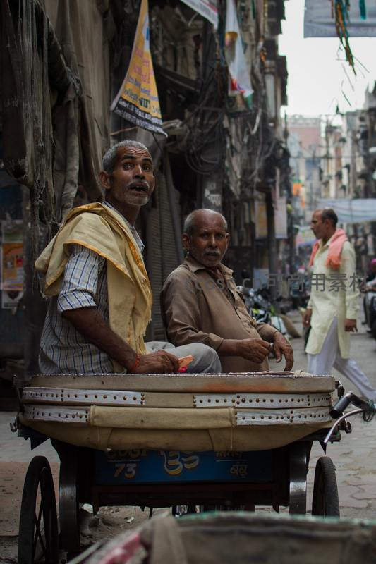 在印度一条狭窄喧闹的巷子里,两位老人坐在人力车上,神情悠然自得,背景是杂乱的电线和店铺,真实记录了当地市井生活的日常片段。