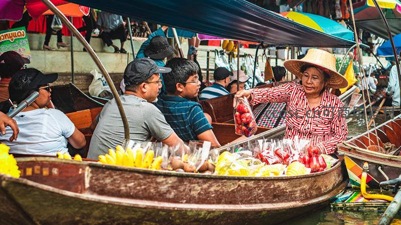 泰国水上市场商贩热情售卖水果