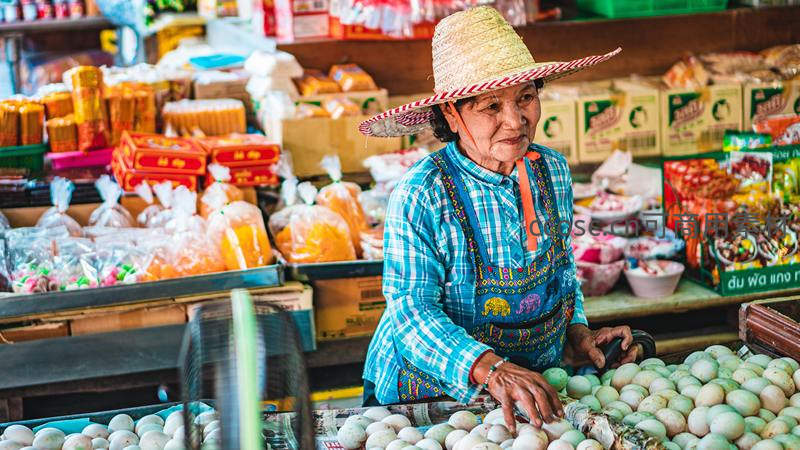 一位戴着草帽的摊主在琳琅满目的商品前,专注地整理着摊位上的禽蛋,展现了市井生活的日常与烟火气。