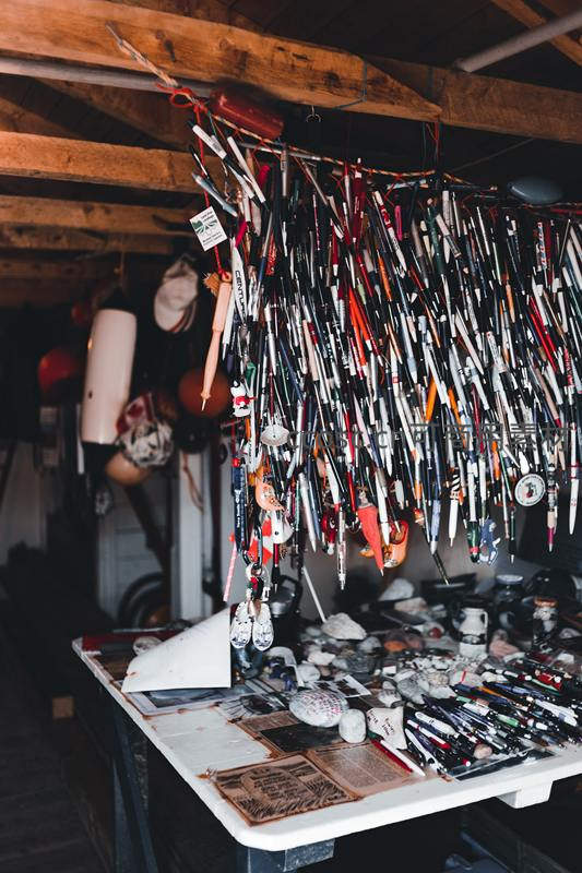 昏暗的阁楼角落里,天花板下悬挂着密密麻麻的各式鱼竿,桌面上散落着石块、旧书和零散工具,展现出一个钓鱼爱好者的私人天地,充满岁月沉淀的怀旧感。