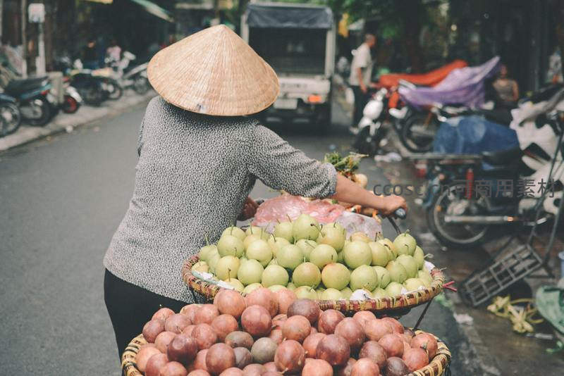 一位头戴传统斗笠的越南妇女推着装满青苹果和百香果的手推车,在喧闹的街边缓慢前行,体现了传统与现代交织的市井日常。