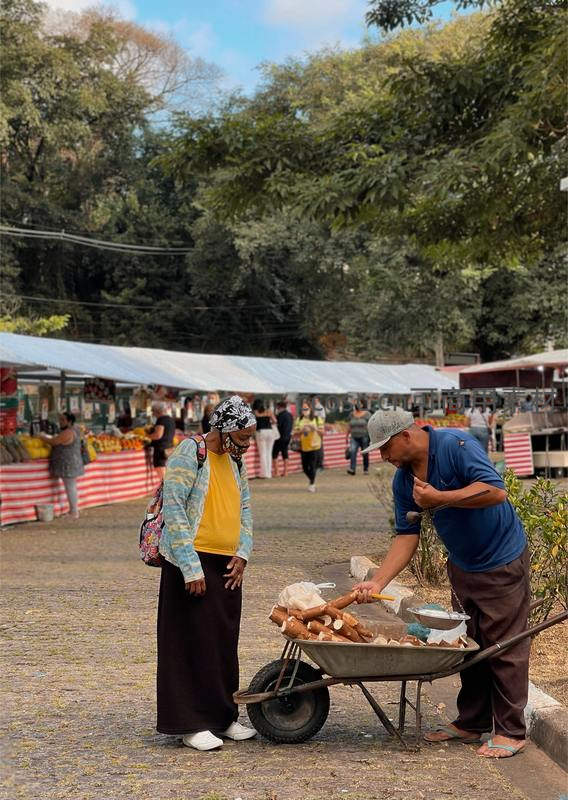 在户外集市,一名男子正从手推车里取出新鲜木薯向顾客展示,背景是林荫下的摊位和行人,营造出轻松自然的农产交易氛围。