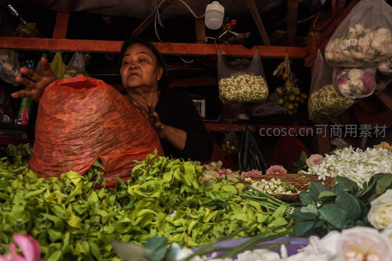 一位年长女商贩在花摊后抱着一袋红色包装的鲜花,面前堆满洁白茉莉与翠绿叶片,神情专注,传递出市井生活的温度与辛劳。