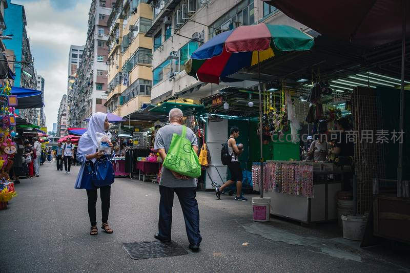 露天市集沿街排开,彩色遮阳伞下摆满琳琅商品,人们悠闲挑选,背景是密集居民楼,体现城市社区中平凡而温暖的生活场景。