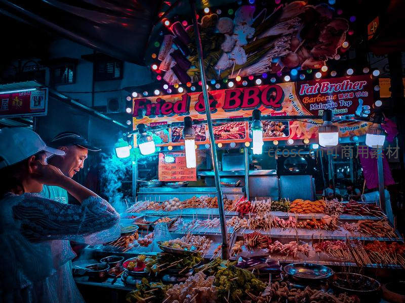 霓虹灯牌下,琳琅满目的烤串与炸物在热气中散发诱人香气,顾客在摊前挑选,充满烟火气息的东南亚街头夜生活场景。