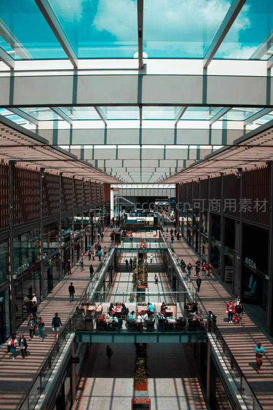 现代购物中心玻璃穹顶下人流穿梭如织