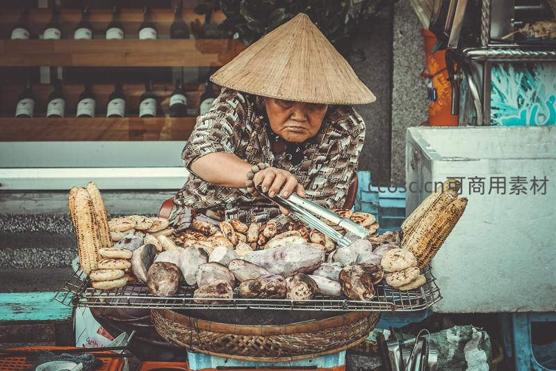 一位年长的摊贩正专注地用金属夹子翻动烤架上的玉米和肉类,烟熏火燎中透出生活的艰辛与满足,背景隐约可见酒瓶货架,充满市井烟火味。