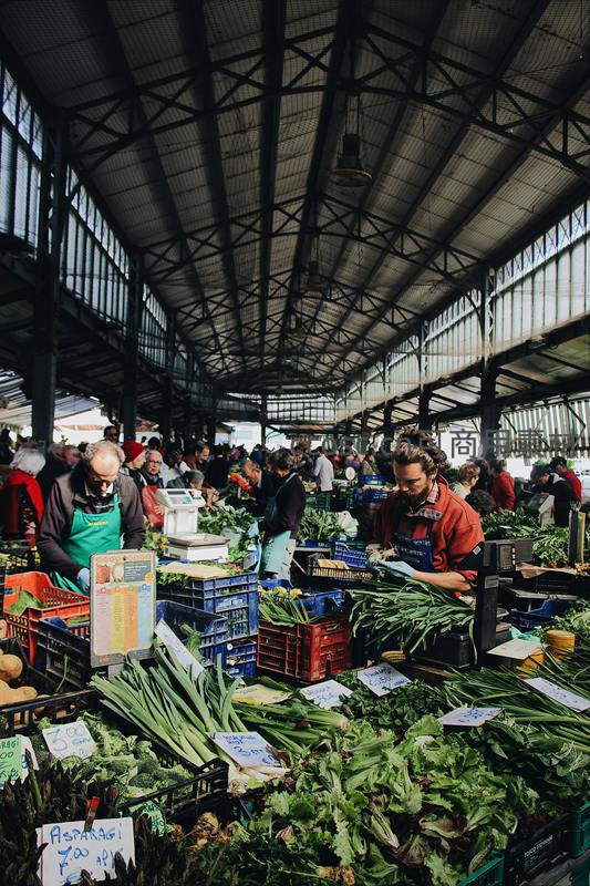 高大的拱形屋顶下,一个熙熙攘攘的室内菜市场里,摊贩们正在整理成堆的新鲜绿叶蔬菜,顾客穿梭其间,充满了生机勃勃的生活气息和本地风情。