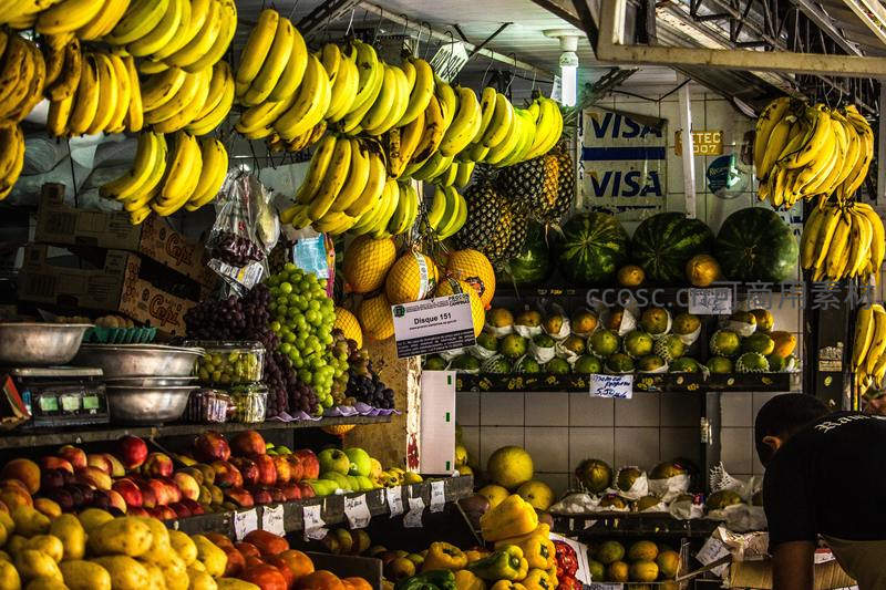水果摊位琳琅满目,香蕉成串挂满货架