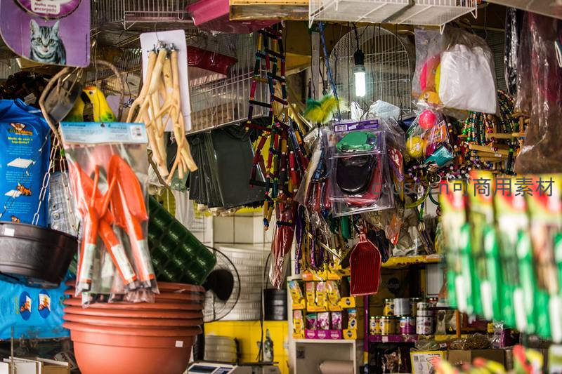 宠物用品店杂乱陈列,鸟笼玩具琳琅满目