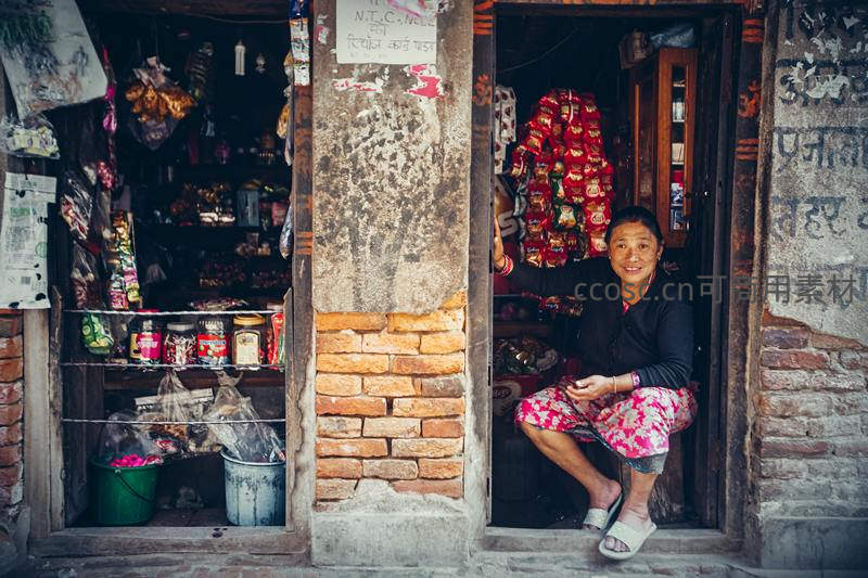 一位面带微笑的妇人坐在古旧店铺门口,店内货架上摆满琳琅商品,她热情地招呼路人,传递出温暖的人情味与地域风情。