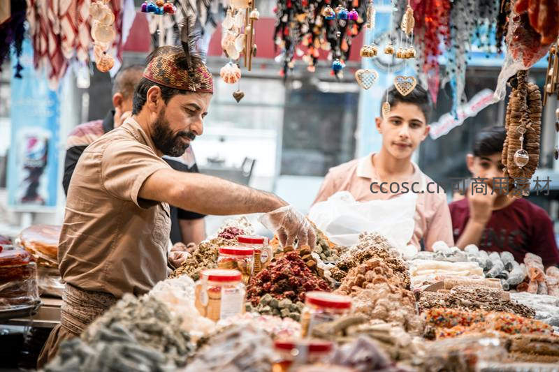 香料摊主为顾客称量,孩童好奇围观
