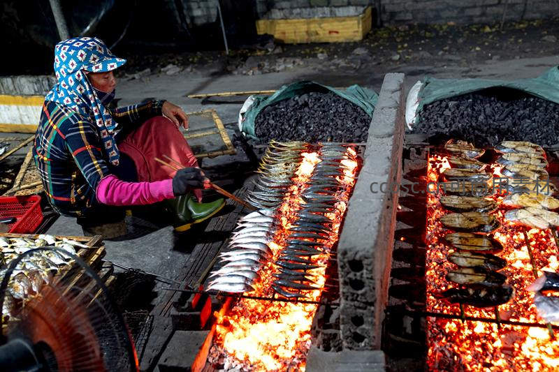 一位摊贩在街边用传统炭火炉烤制新鲜海鱼,火焰跳跃,香气四溢,展现了充满活力的东南亚街头饮食文化与日常生活场景。